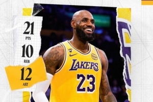 最老三双!湖人官方发布詹姆斯本场21+10+12数据海报