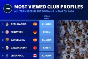 德转3月俱乐部页面浏览量排名:皇马居首,拜仁、巴萨二三位
